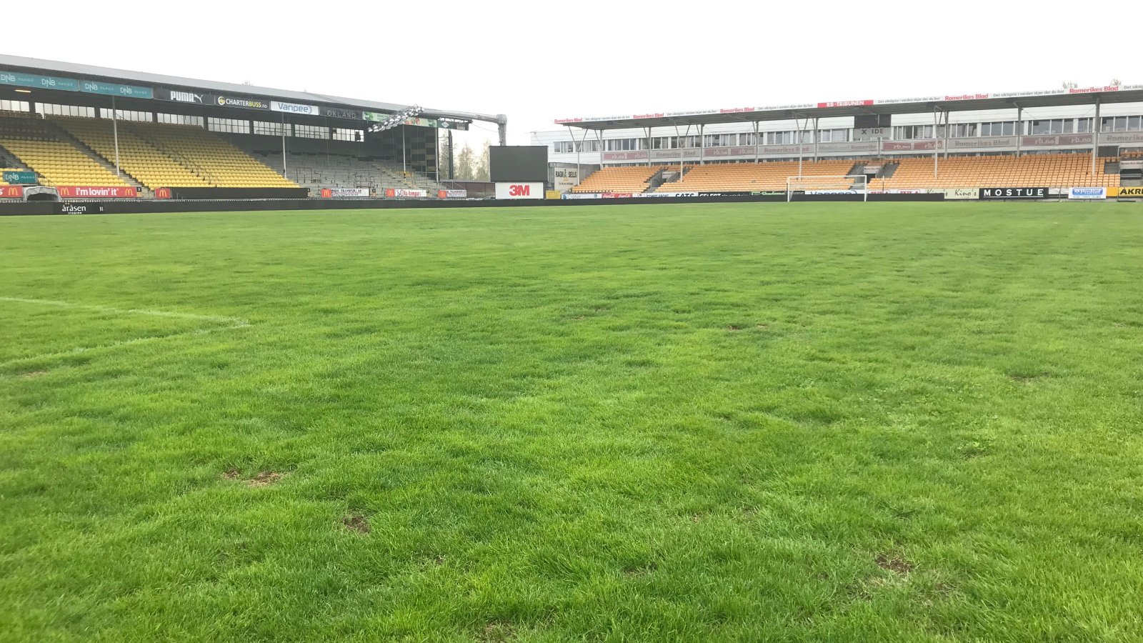 - Mange av de hullene på matta er soppskader. De større feltene er der gresset døde under treningene i fjor. Til å begynne med er gresset halvdødt og dødt. Nå er det døde gresset borte, og det som var halvdødt har vokst. Mot Haugesund vil nok banen være kanskje litt bedre eller lik som den var mot Molde.