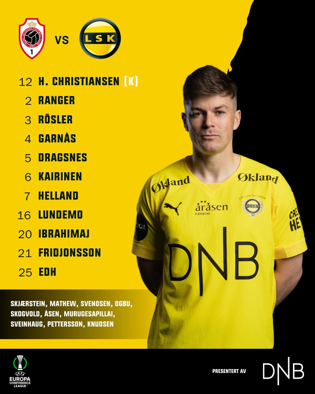 Mads Hedenstad Christiansen er kveldens kaptein når LSK møter Royal Antwerp i Europa Conference League-kvalifiseringen.