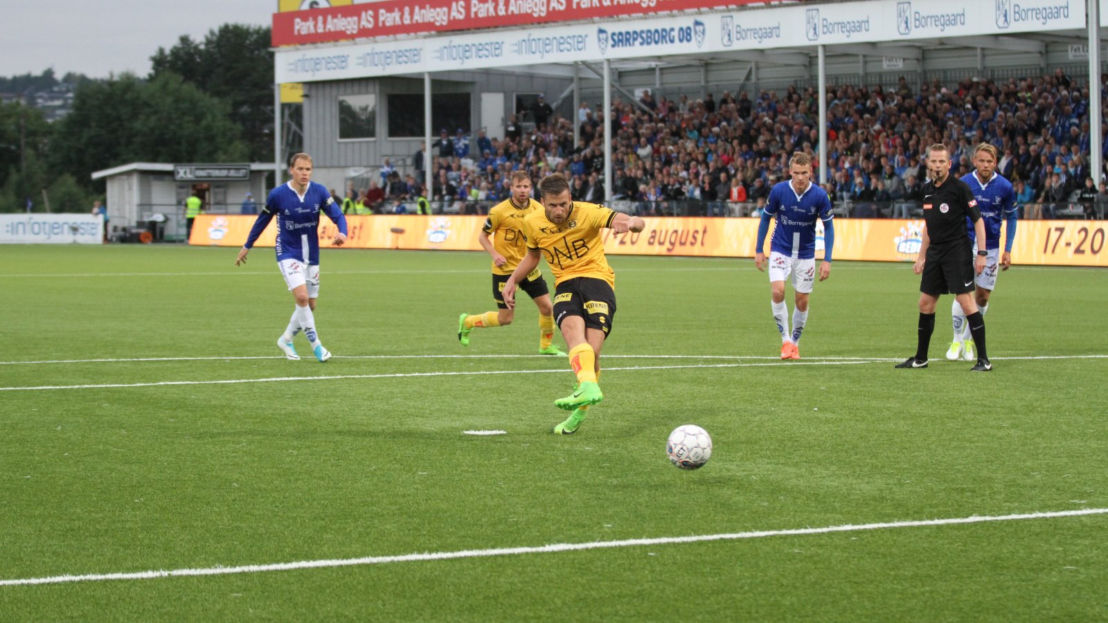 Kanari-fansen rekker ikke å juble ferdig før hjemmelaget slår tilbake. En tellefeil i forsvaret sørger for at unggutten Tobias Heintz får stå helt alene og heade inn utlikningen. Det står 1-1 i Sarpsborg.
