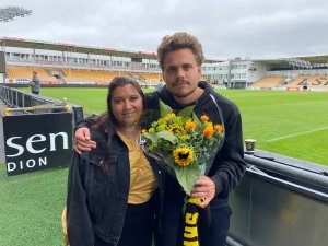 Tobias Svendsen (22) fikk i dag blomster fra Kanari-Fansens Christine Tovik etter at han har bestemt seg for å ta en pause fra fotballen i håp om å få slutt på angstproblemene. LSK-spilleren takker for støtten han har fått både fra Fuglafamilien og resten av Fotball-Norge.