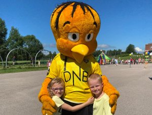 Henrik (7) og Anna (7) fra Sten Tærud SFO gleder seg til å dra på Åråsen etter å ha fått billetter av Gullik til hjemmekampen mot 10. juli. LSK-maskoten var et svært populært innslag på sommeravslutningen tidligere denne uken.