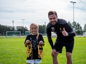 Blant de mange barna som deltar på OBOS fotballskole var det 7 år gamle Amalie som kunne juble over å få fotballskoene til Arnór Smárason.