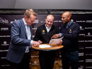 Bak utskremt LSK-reporter, Magnus Rebbestad, sitter Edmund William Ellingsen og Mehran Zareie i Zen Finans. I dag signerte de en avtale med LSK som gjør de til årets bortekampsponsor.