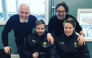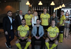 Finansiell rådgiver Dagfinn Larsen og regionbanksjef Kim Herseth gir Simen Rafn og Kristoffer Ødemarksbakken et vennlig klapp på skulderen. For femte året på rad er DNB generalsponsor for LSK. Avtalen skaper et unikt engasjement - hos begge parter.
