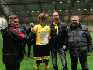 (Lillestrøm 2 - Skjetten 2-3) Det ble et knepent tap mot Skjetten, men det har blitt schwung over bestemannspremien på LSK 2-kampene. Juryformann Ole-Einar Foss (nummer to fra høyre) kunne gratulere Magnus Knudsen (17) med gratis lunsj på Fratelli.