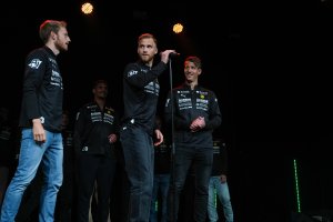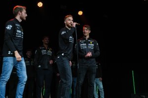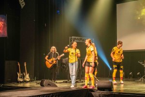 Hele Fuglafamilien var samlet på scenen under torsdagens kickoff på Lillestrøm Kultursenter - til stor glede for en fullsatt sal. Grip mikrofonen-seansen fikk virkelig fram vinnerinstinktet hos damelagets Oda Øisetkjølen (til venstre), LSK Kvinners Mia Authen og LSKs Thomas Lehne Olsen.